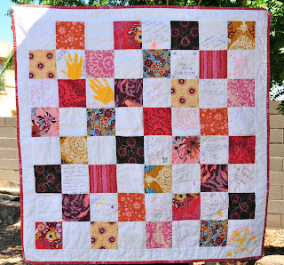 Here are some pics of the quilt in the signature process at my shower. I used colored fabric markers that matched the colors of the quilt. I let the kids at my shower do handprints or fingerprints using fabric paint.